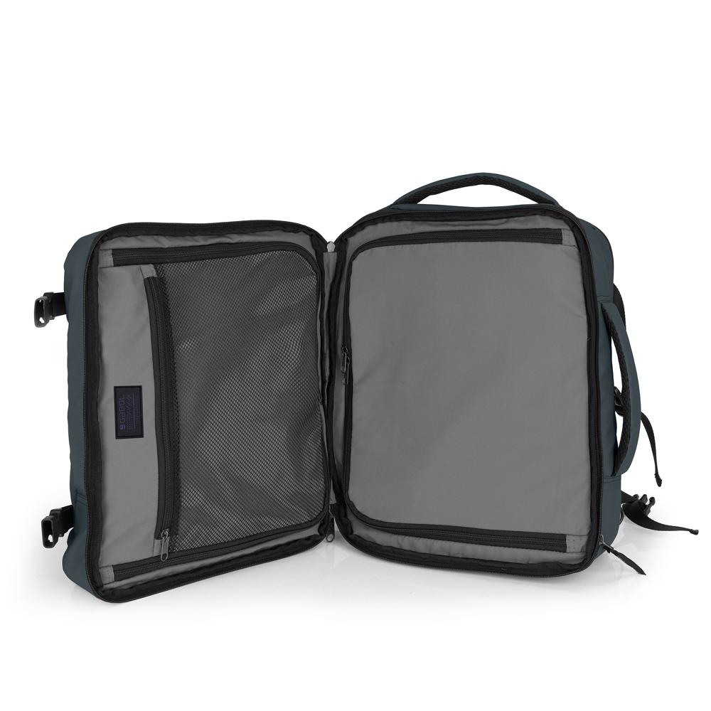 - Departamento delantero multifuncional, con organizador interno para documentos, cables, accesorios y objetos personales, garantizando un acceso rápido y ordenado durante el viaje.
