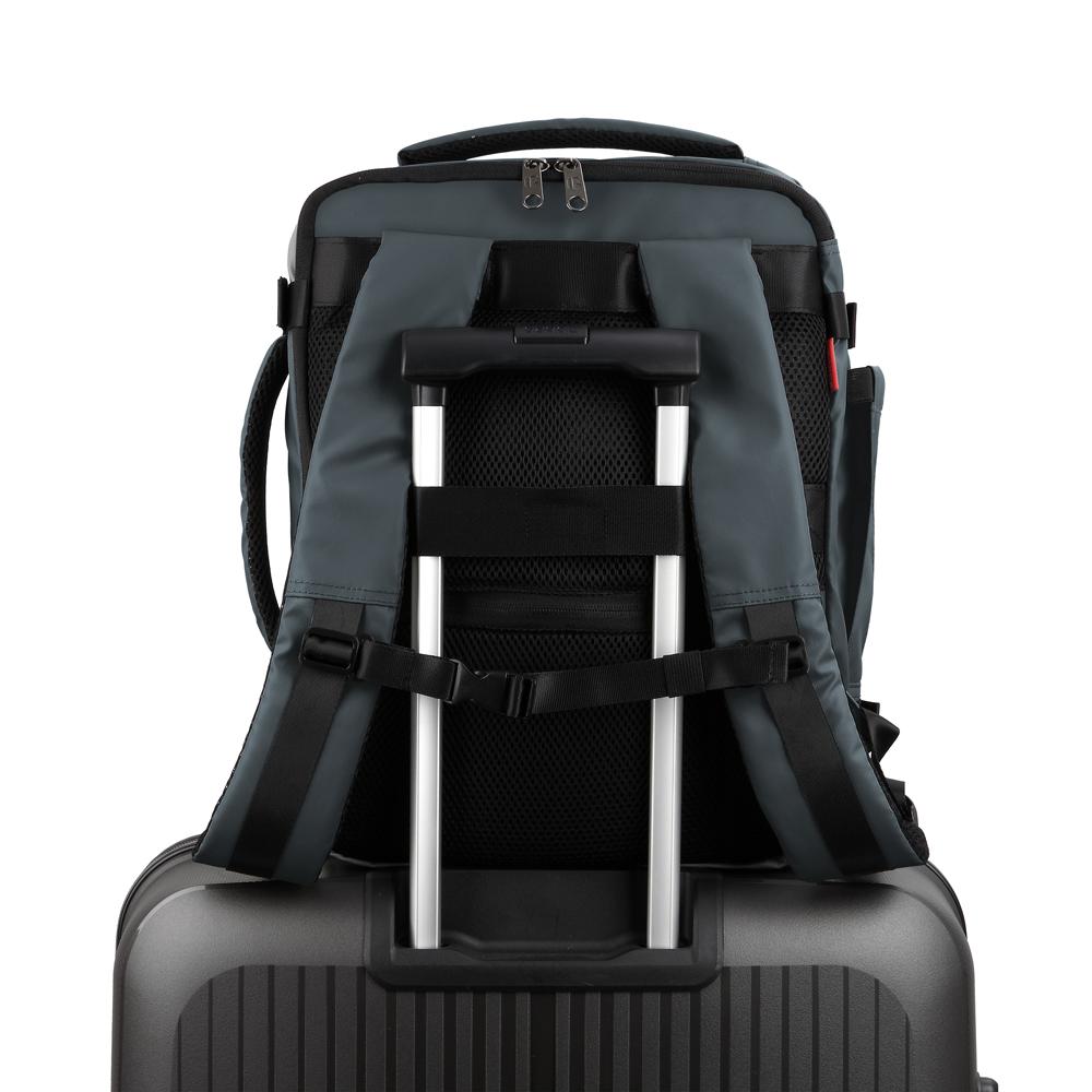 - La cinta trasera para acople a maleta trolley permite un transporte cómodo y seguro durante desplazamientos más largos.